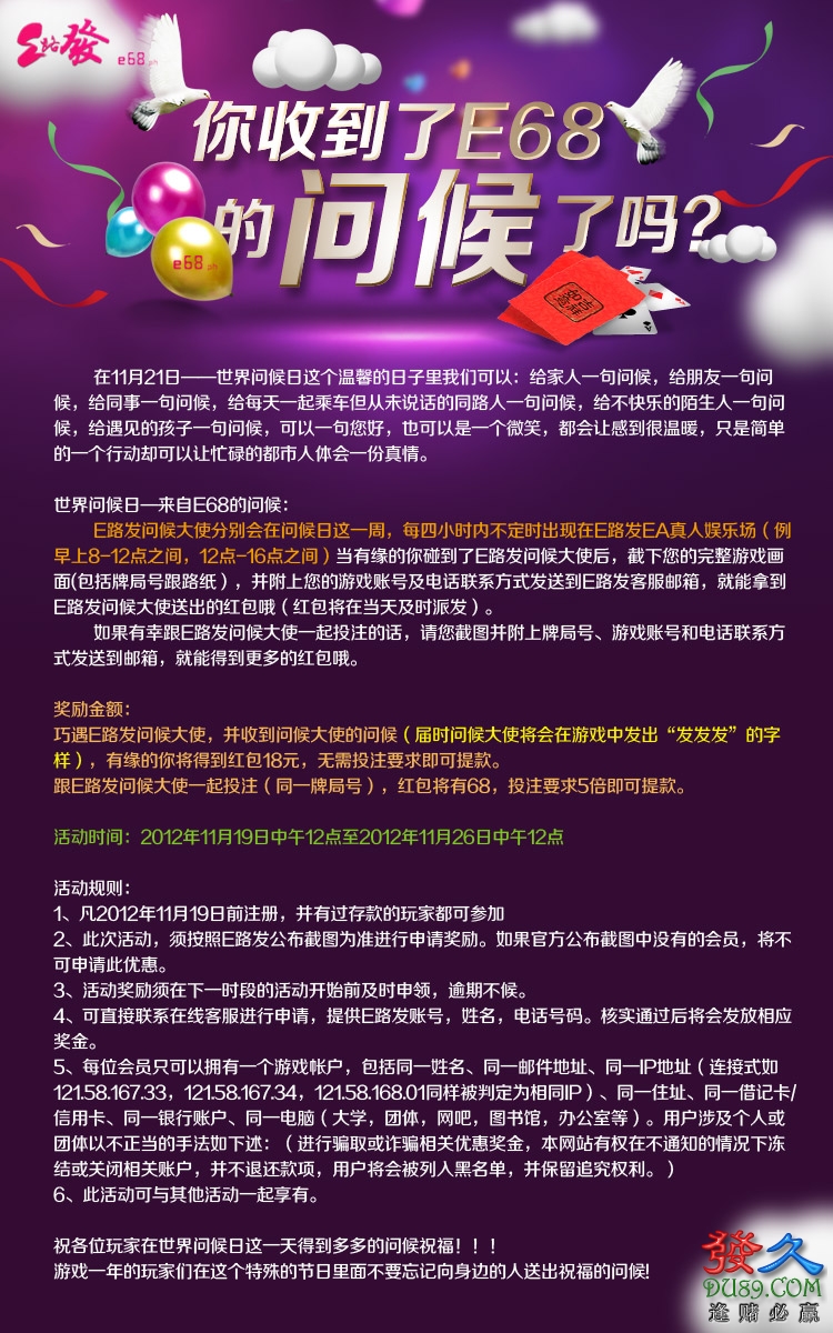 1.凡2012年11月19日前注册,并有过存款的玩家都可参加发久论坛 本文章来源于:http://bbs.du89.com