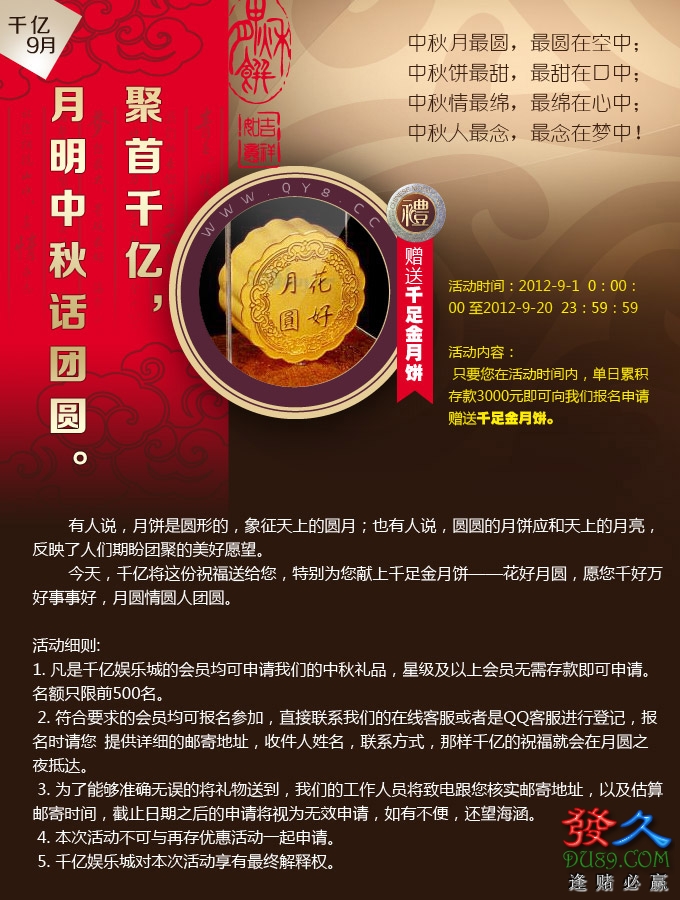 1.单日累积存款3000元即可向我们报名申请赠送千足金月饼. 2.星级及以上会员无需存款即可申请赠送千足金月饼. 3.名额只限前500名. 发久论坛运佳专业预测分析 博彩策略 http://www.du89.com/